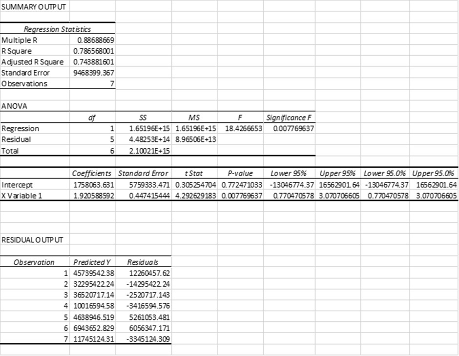 The Standard Error is the average distance of values that observed values fall from the regression line. The smaller the error, the more accurate the regression analysis is. In this case, the values fall an average of 93%, 9468399.367 units from the regression line. The Standard error also shows how well the model fits the research question. * This value is suited to logistic regression.